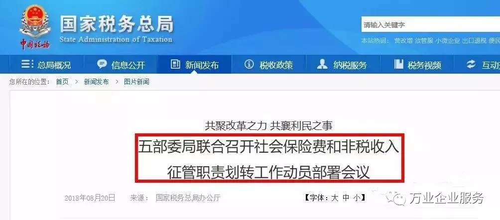 根據之前國家稅務總局、財政部、人力資源和社會保障部、國家衛生健康委員會、國家醫療保障局視頻會議部署,今年12月10日前要完成社會保險費和第一批非稅收入征管職責劃轉交接工作,自2019年1月1日起由稅務部門統一征收各項社會保險費和先行劃轉的非稅收入。