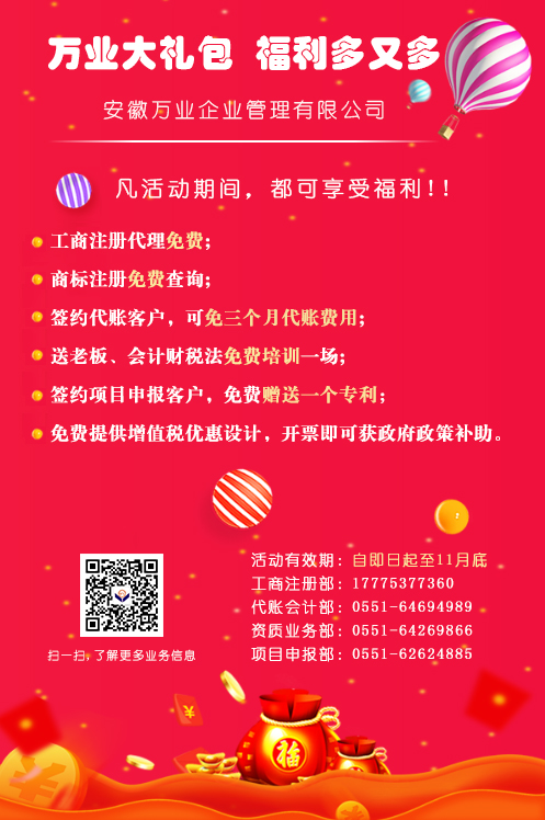 安徽萬業(yè)企業(yè)管理有限公司成立于2006年,從事企業(yè)服務十余年。公司主營業(yè)務:資質新報、升級、增項、公司注冊、財稅代賬、稅務籌劃、項目申報等業(yè)務。且已經成功辦理上萬家公司注冊、資質申辦業(yè)務及財稅代賬客戶上千家。